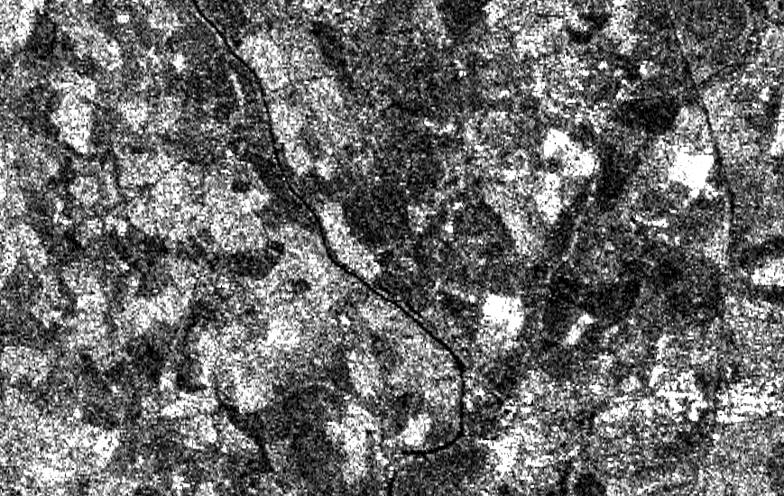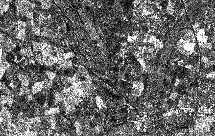 ERS Images for Change Detection. Left: Before the flood. Middle: during the flood. Right: result of the correlation change detector