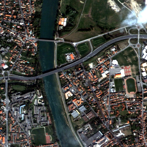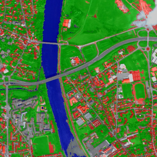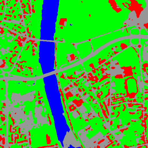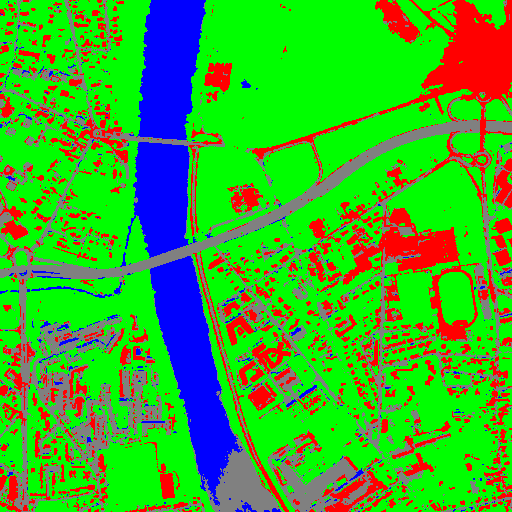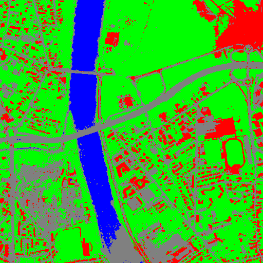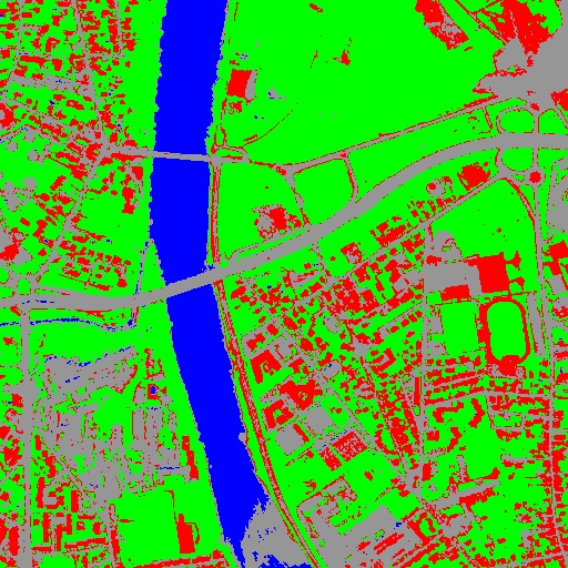 Resulting from the application presented in section Fancy classification results and illustrated in Figure2, the Figure6 shows a regularization of a classification map composed of 4 classes: water, roads, vegetation and buildings with red roofs. The radius of the ball shaped structuring element is equal to 3 pixels, which corresponds to a ball included in a 7 x 7 pixels square. Pixels with more than one majority class keep their original labels.