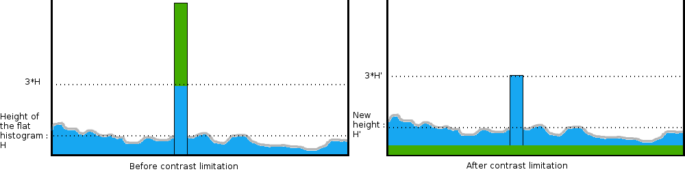 The ContrastEnhancement application also offers a way of limiting the contrast by adjusting the original histogram with the hfact parameter. The limitation factor represents the limit height that any bucket of the histogram can have; the application computes the height of the flat histogram and the maximal height is the limitation factor time this “flat height”.