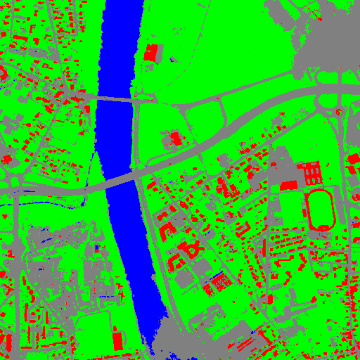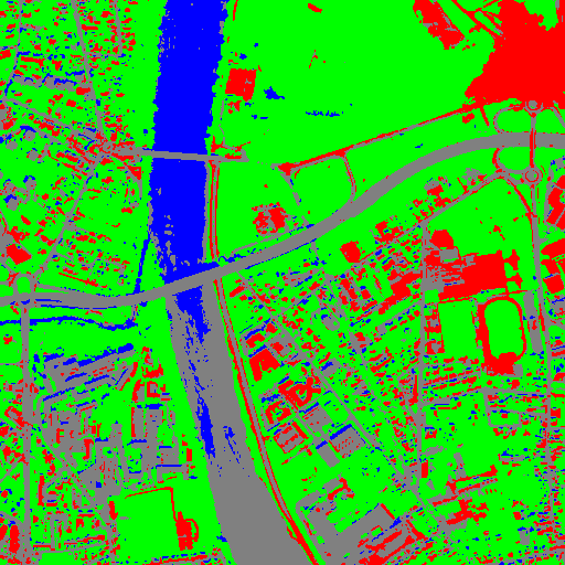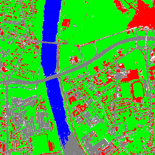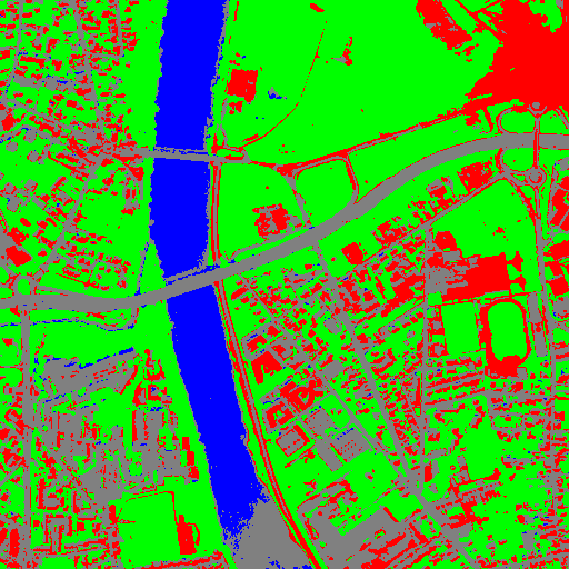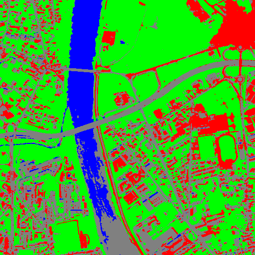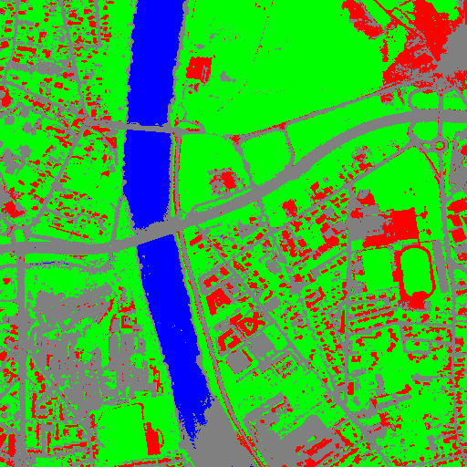 Resulting from the application presented in section Fancy classification results and illustrated in Figure2, the Figure6 shows a regularization of a classification map composed of 4 classes: water, roads, vegetation and buildings with red roofs. The radius of the ball shaped structuring element is equal to 3 pixels, which corresponds to a ball included in a 7 x 7 pixels square. Pixels with more than one majority class keep their original labels.