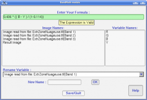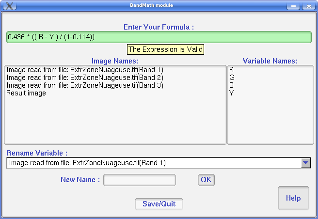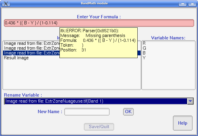 This new functionality has also been included into the Monteverdi application to provide a intuitive way to perform complex band computation the easy way. The module also prevents error in the mathematical command by checking the expression as the user types it, and notifying information on the detected error:
