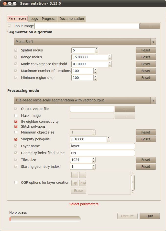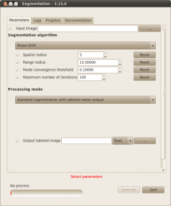 Everything that has been developed to enhance the experience of segmenting remote sensing images is packed into a single application, and I will give a tour of it in this post. For those who are not familiar with the new application framework introduced in the latest release, this is a good opportunity to catch up ! Here is what the Graphical User Interface looks like (you can launch it by typing otbgui_Segmentation on your command-line, or by clicking on the otbgui_Segmentation executable file, and even directly use the SWIG interface in python for instance). You can find detailed documentation on how to use this new application framework, as well as a complete documentation of all available applications in our CookBook.