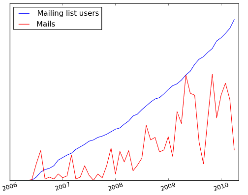 Here is a graph that shows the activity on the OTB users mailing list in the last 4 years. In blue, the number of registered users and in red, the number of mails per month.
